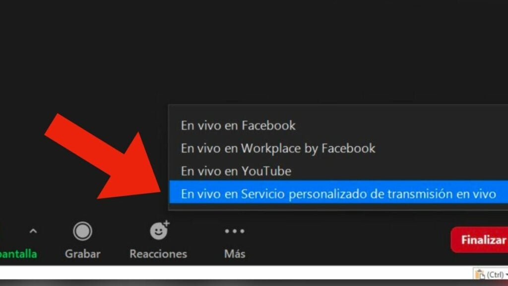 Ahora, cuando quieras iniciar una retransmisión en vivo, tendrás que realizar una reunión dentro de Zoom. Con la reunión ya iniciada, selecciona el apartado de Más (tiene un símbolo de tres puntos justo arriba de su nombre) y haz clic sobre En vivo en Servicio personalizado de transmisión en vivo.