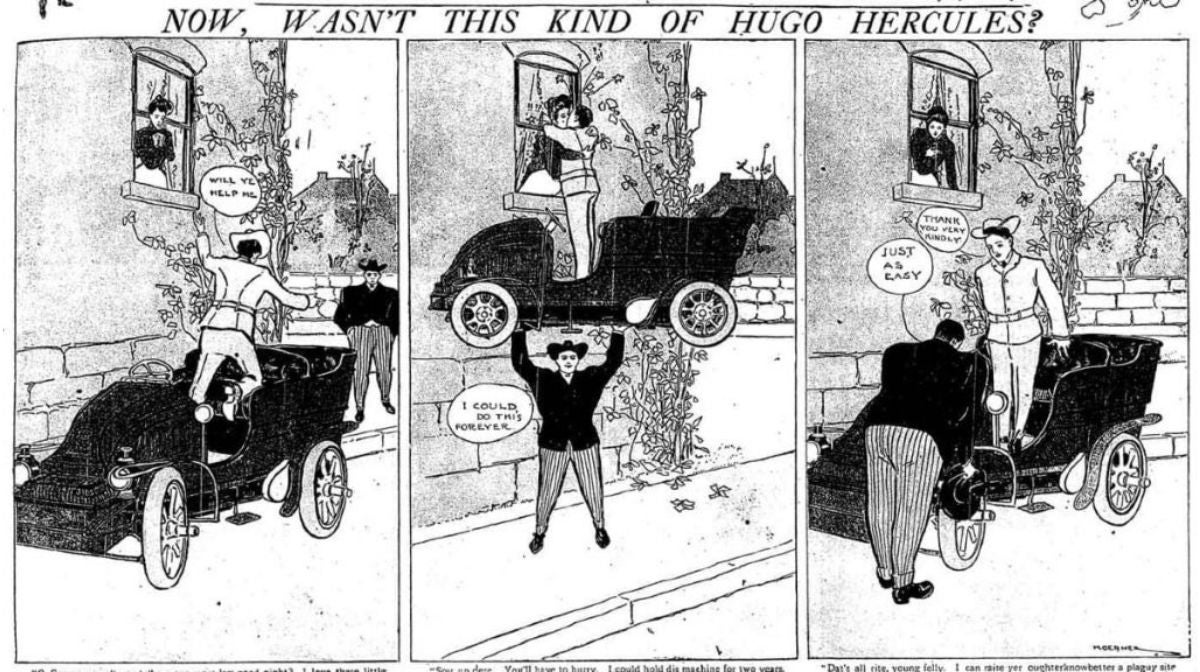 En aquella primera tira, paraba un tranvía con sus propias manos para que una señorita pudiera subirse y se presentaba como “Hugo Hercules, el chico maravilla”. Se trataba de tiras normalmente de tres viñetas cada una en las que se planteaba un problema (Hugo va a patear un balón y en su lugar chuta la casa) que el héroe solucionaba (en este caso, recuperándola por los pelos). Ni supervillanos, ni leches.