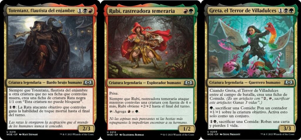En Magic hay cinco colores, por lo tanto hay diez combinaciones de dos colores; diez posibles arquetipos de draft. Todos ellos haciendo diferentes guiños a los cuentos clásicos. Algunos son muy explícitos, como el de Ruby, Daring Tracker, que es Caperucita Roja o Neva, Stalked by Nightmares, que es Blancanieves. Pero los más graciosos son los que lo son por cómo encajan dentro de las mecánicas del juego. Totentanz, Swarm Piper se basa en el Flautista de Hamelín y no para de crear ratas y Greta, Sweettoth Scourge se basa en Hansel y Gretel y puede sacrificar tokens de comida para producir diferentes efectos. Dos guiños que cogen los cuentos originales para crear efectos divertidos en el juego.