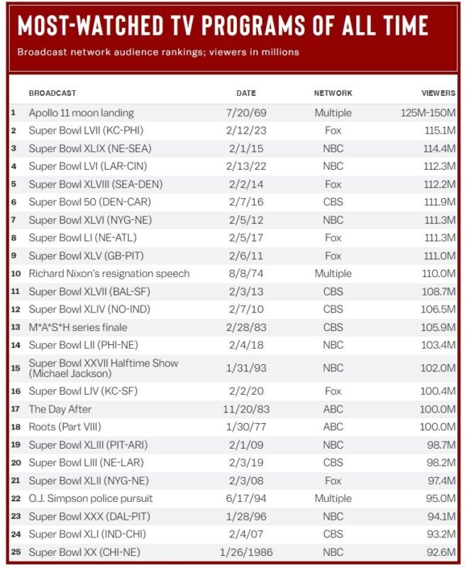 De los 25 programas de televisión más vistos en la historia de Estados Unidos, hay 18 Super Bowls en la lista. Eso incluye el partido del año pasado entre los Chiefs y los Eagles, que, además de ostentar la corona de audiencia de la competición, es también el segundo programa de televisión más visto de la historia.