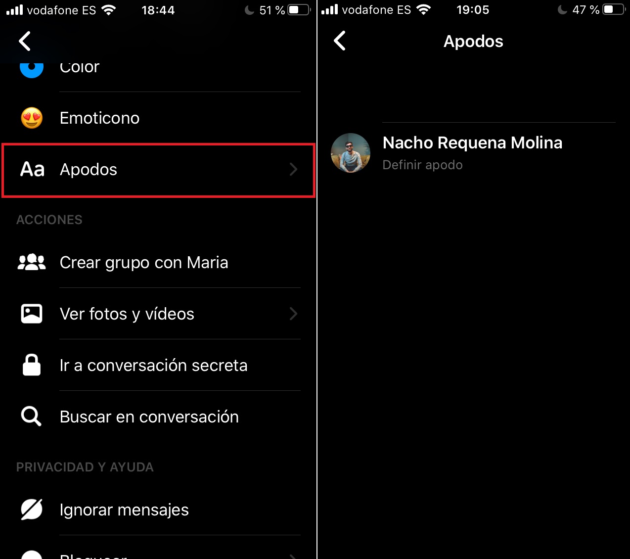 Para ello, busca de nuevo el botón de “Información” o pincha sobre el nombre de esta persona para acceder a las opciones de dicho chat. Una vez realizado esto, fíjate en la casilla que no lleva a equivocación alguna: “Apodo“. Así de simple. Aquí puedes cambiar el nombre a esa persona y ponerle su “apodo” de toda la vida; ¡y ojo, ya que tú también puedes a ti mismo!