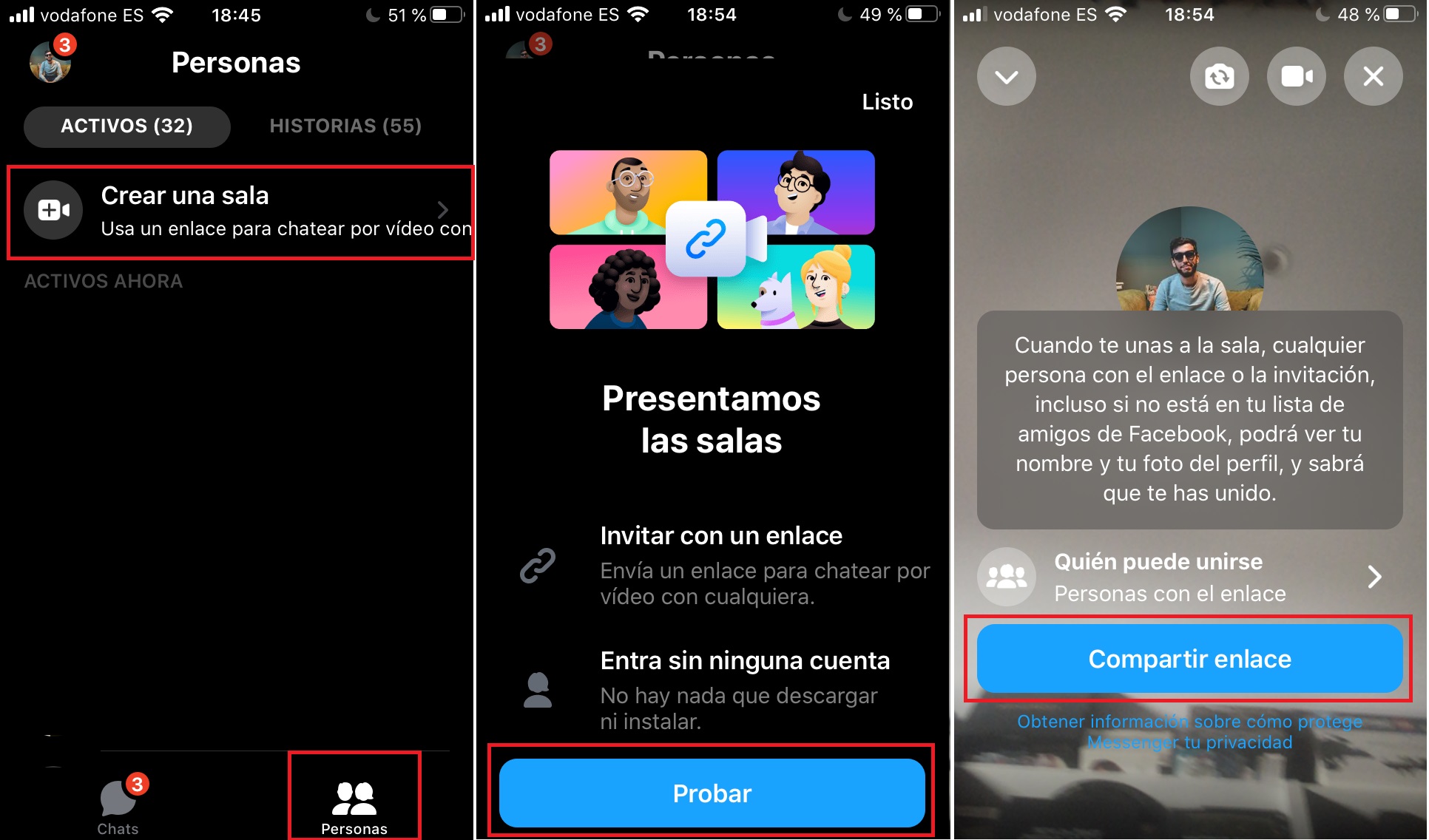 Para crear una sala en tu smartphone, fíjate bien en la opción que aparece abajo del todo, una denominada “Personas“. Acto seguido, lo primero que te va a salir en este campo es “Crear una sala“. Tan fácil como pulsar ahí, pinchar en el banner de “Probar” y luego en “Compartir enlace“. Ya está. Ahora sólo tienes que pasárselo a esas personas con las que quieres compartir una alegre conversación.