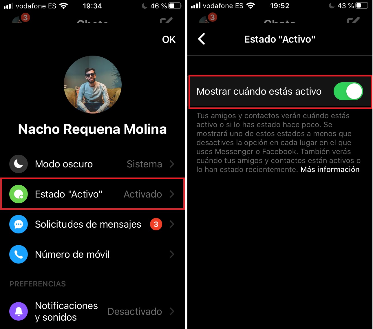 Cuando quitemos el “activo”, tus amigos y contactos no verán cuándo estás activo o si lo has estado hace poco, es decir, no tendrán ninguna indicación. Así mismo, tampoco podrás ver si tus amigos o contactos están activos (la ley de reciprocidad típica de estas apps). Por cierto, es necesario desactivar esta opción también en Facebook general. De lo contrario, aparecerás “Activo” en su plataforma.