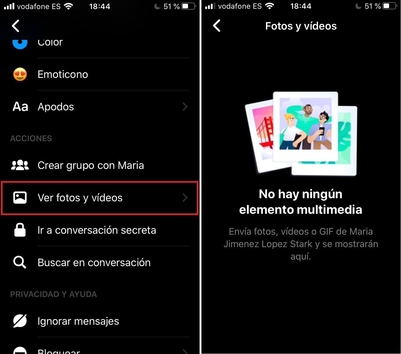 En WhatsApp es realmente fácil visionar todos los archivos que una persona nos ha enviado para consultarlos posteriormente… ¡y en Facebook Messenger es igual! Sólo tienes que cliquear dentro de “Información” (pinchar en el nombre de usuario) e irte casi hasta el final de las opciones. Justo ahí encontrarás un campo que reza “Ver fotos y vídeos”. Pincha de nuevo sobre el mismo y entrarás en el campo dedicado a todos y cada uno de los elementos intercambiados hasta la fecha.