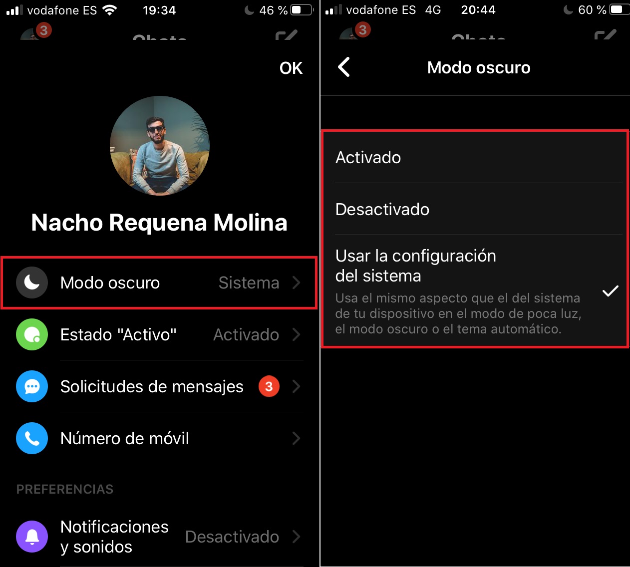 Para activarlo sólo es necesario entrar en Messenger, pinchar en tu foto de perfil (esquina superior izquierda) y fijarse en una de las primeras opciones que aparece: “Modo oscuro“. Dentro de esta casilla encontrarás tres modos: “Activado”, “Desactivado” y “Usar la configuración del sistema”. Si lo tienes habilitado por sistema operativo, te aparecerá esta última; ahora bien, si tu firmware no lo permite, pincha en “Activado” y listo.