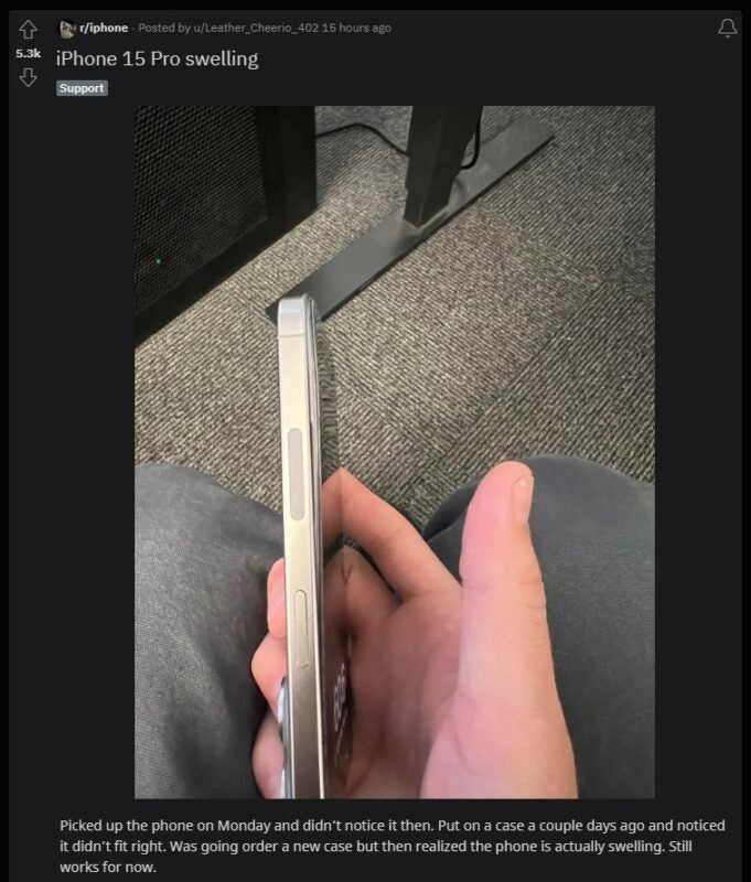 El propietario del iPhone 15 Pro también ha dicho que la Apple Store más cercana no fue de ayuda en el asunto, ya que cuando explicó que el modelo con la batería hinchada fue comprado en Verizon, se aconsejó al individuo que visitara dicha tienda.