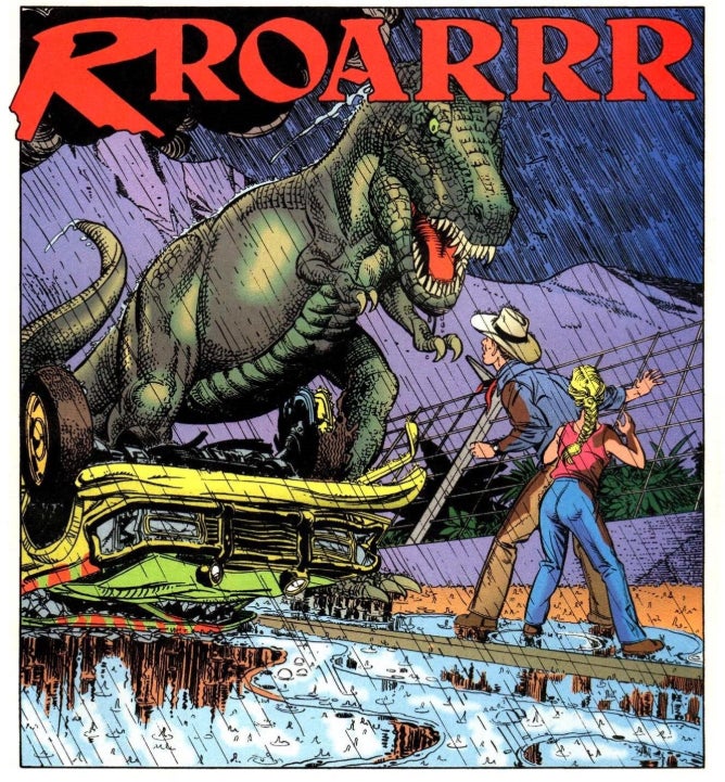 No te haces una idea de la cantidad de tebeos que han continuado la historia de Parque Jurásico desde su estreno en 1993. De hecho, el mismo mes que la película llegó a cines ya lo hizo junto a una adaptación de la película de cuatro números que además contaba con una pequeña precuela. A partir de ahí, el salvaje Oeste dinosáurico: secuelas, precuelas y spin-offs de todo tipo se acumularon a lo largo de 28 números donde, entre otras cosas, pudimos ver el regreso de Alan Grant y los personajes de la primera parte en Return to Jurassic Park… que quedó invalidado con El mundo perdido, que tuvo su propia adaptación en 1997 antes de abandonar la rama de los cómics por completo.