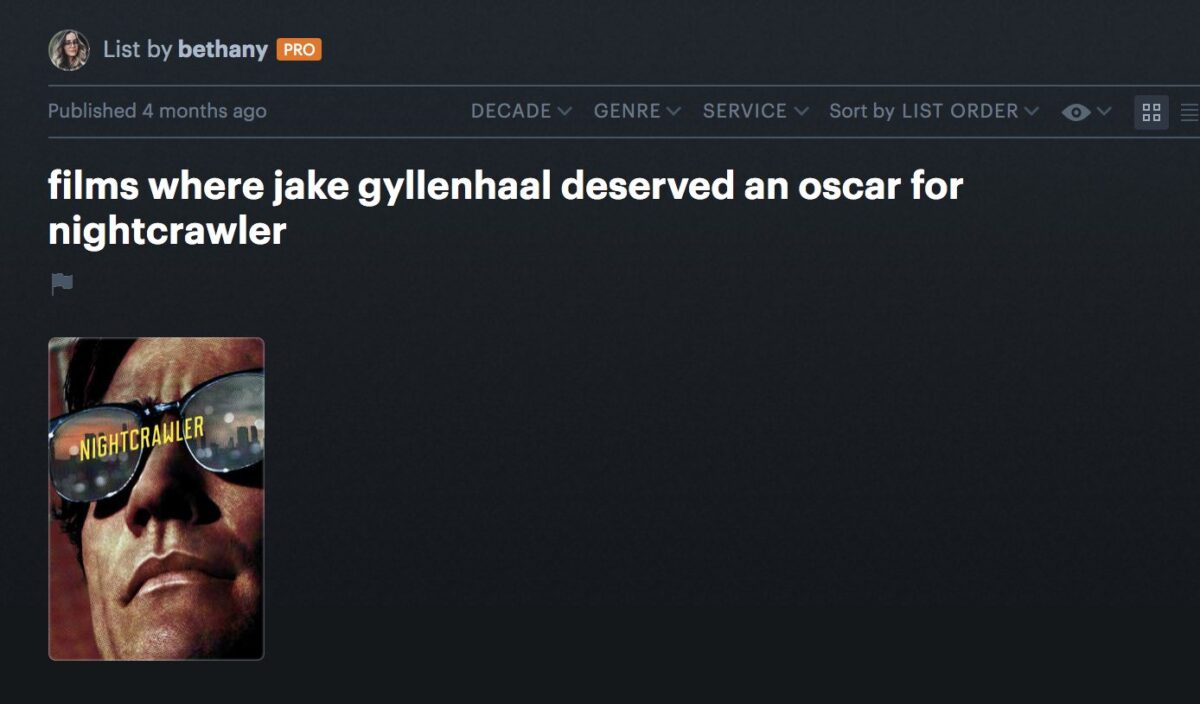 Letterboxd es como si Goodreads no se tomara en serio a sí misma. Más allá de unos cuantos cinéfilos que hacen análisis interesantes y larguísimos de las películas que ven, la mayoría vamos a intentar hacer reír al resto. Si vemos, por ejemplo, El crepúsculo de los dioses (mi película favorita), la primera crítica destacada está repleta de iconos mostrando las diferentes caras de Norma Desmond y una de las siguientes dice “Esta película trata sobre la peor pesadilla de cualquier guionista: ser asesinado de un tiro”. Chef kiss.
