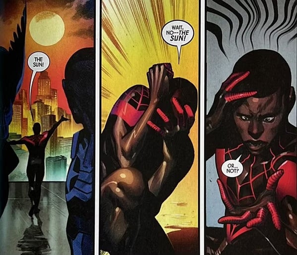No pasa nada: Júbilo lleva siendo vampira desde hace años y ahí sigue, siempre que se aparte del sol… ¿O no? Pues parece que no, porque el Doctor Muerte ha conseguido que el sol ya no dañe a los vampiros, lo que quiere decir, básicamente, que Miles Morales es colega (literalmente) de Drácula… y que su vida, más allá de beber sangre y ser inmortal, no va a tener tantos cambios. Bien mirado, tampoco es poca cosa precisamente.