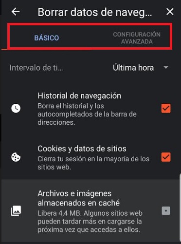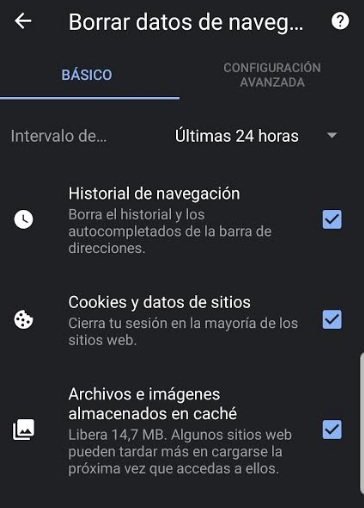 Si seleccionas los datos de navegación básicos podrás elegir entre borrar el historial de navegación, las cookies y datos de sitios así como también los archivos e imágenes almacenados en caché.