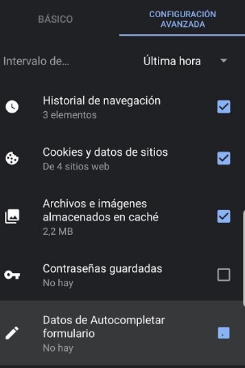 Si por el contrario eliges la configuración avanzada, además de las opciones anteriores también podrás elegir si borrar las contraseñas guardadas y/o los datos de autocompletar de los formularios.