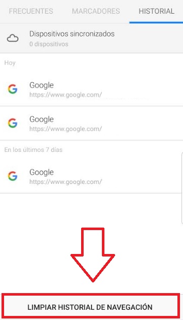 Ya en el historial de navegación podrás ver las últimas páginas que has consultado desde tu móvil. Justo en la parte inferior de la ventana aparecerá la opción “Limpiar historial de navegación”, pulsa en ella para continuar con este proceso.