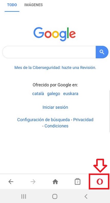Una vez con el navegador abierto, pulsa en el icono con el logotipo de Opera que aparece en la esquina inferior derecha de la pantalla (tiene la apariencia de una “O” de color rojo).