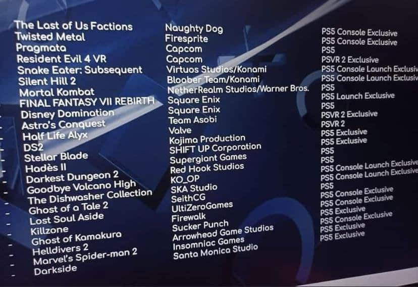 Aquí vemos una lista de títulos, sus estudios y dónde serán lanzados. Que haya una sutil marca de agua que diga «confidencial» y el fondo de los streamings de Sony podría hacernos creer que es un leak legítimo. Lo más probable es que no lo sea. Que sólo haya títulos para PlayStation 5 y PlayStation VR2, olvidándose de PlayStation 4 cuando aún está recibiendo activamente juegos es, como poco, sospechoso. La ausencia de juegos de un perfil menos alto, la práctica ausencia de third parties y que los juegos de PlayStation VR2 no salgan todos agrupados, como siempre ha hecho Sony, además de lo elaborado del formato para algo que debería ser una comunicación interna, hace de este leak algo muy poco creíble.
