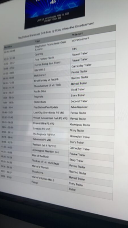 Hablando de leaks creíbles, este tiene sentido. Parece una escaleta y de hecho, tiene sentido como escaleta. Tiene duraciones exactas, títulos de cada juego y la clase de contenido que presenta. No tiene solo toda clase de juegos, sino también anuncios que no son juegos. Es creíble. Excepto por las fragantes faltas de ortografía, como poner «Titel» en vez de «Title»; que la foto sea a una pantalla —uno de los clásicos inmortales de los falsos leaks, junto con que la foto sea borrosa—; o que el leak, aparecido en 4chan, no proviene de ningún nombre conocido. ¿Esto lo hace falso? No necesariamente. Puede ser un fallo legítimo de alguien de Sony y puede ser un documento interno. Pero salvo que el leaker tenga un historial que nos haga confiar en lo que dice, si algo parece falso, es mejor asumir siempre que es falso.