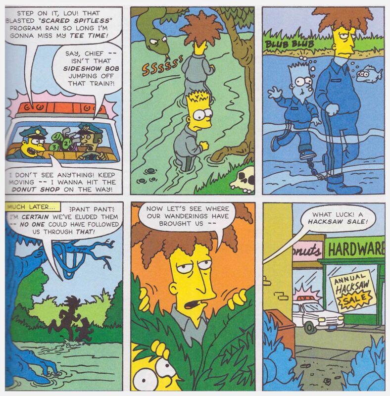 Bongo Comics empezó a lanzar cómics de ‘Los Simpson’ en 1993, en el momento álgido de su fama, y aún continuaron apareciendo hasta 2018. Por el camino vimos estupendas versiones de Halloween, un crossover fabuloso con ‘Futurama’ y decenas de spin-offs y números únicos sobre casi todos los personajes de Springfield, desde el tío de la tienda de cómics hasta Radioactivo-Man. Bongo Comics acabó quebrando, y dada la calidad de la serie actual, no parece que nadie vaya a ir al rescate.