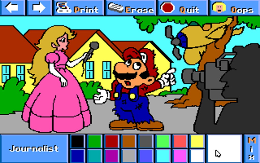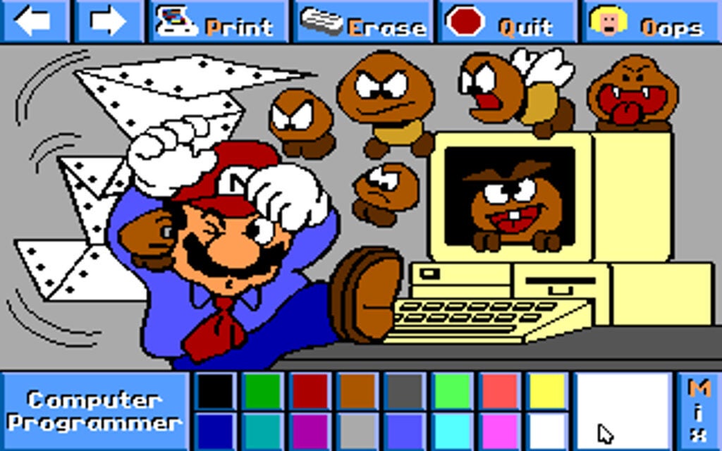 Lo que se le ocurrió a Brian A. Rice fue mucho más decepcionante: un juego de pintar a Mario y compañía en distintas profesiones valiéndose del ratón. No busques más: esto es lo que hay.