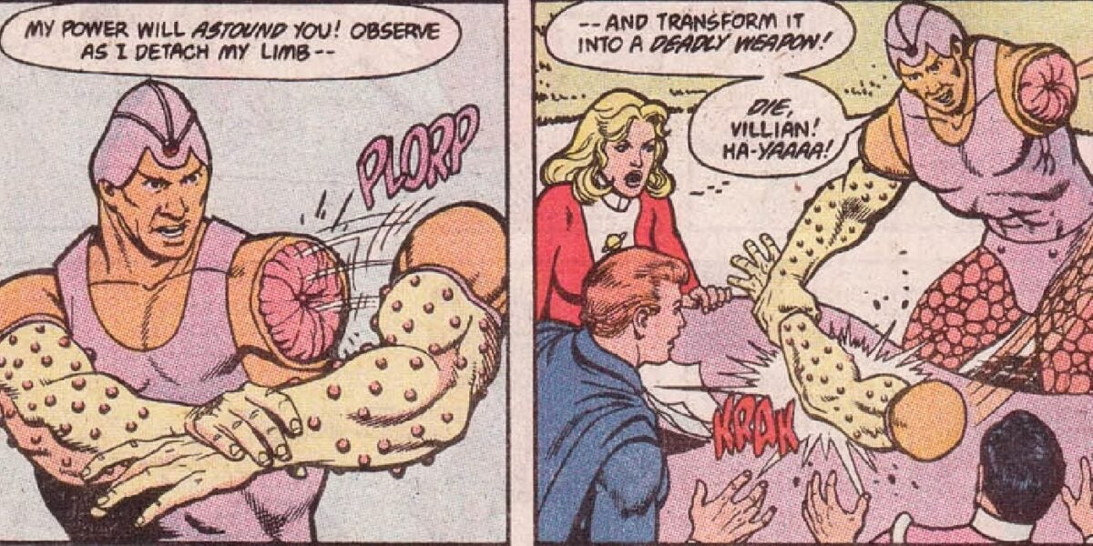 Floyd Belkin viene del siglo XXX, pero apareció por primera vez en nuestras vidas en diciembre de 1989, en el número 46 de ‘Secret Origins’, de DC. Y su superpoder increíble es… poder quitarse sus propios brazos y usarlos como armas. Sí. Incluso puede unir un brazo a otro brazo para crear un mega-brazo gigantesco. Fue rechazado por la Legión de Superhéroes, y con razón.