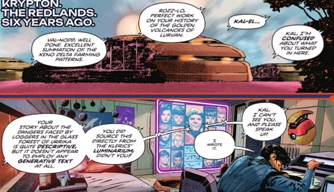 Ha sido en el número 2 de Absolute Superman, los cómics de DC ambientados en un nuevo universo, donde descubrimos cómo era la adolescencia de Kal-El en Krypton (porque sí, esta versión del personaje no vino a la Tierra tan pronto). Allí vemos cómo se mete en problemas porque, en lugar de utilizar el texto generativo en el instituto, lo escribe por su cuenta. Y parece una locura, pero ya hay trabajos donde están reprendiendo a los redactores o a los guionistas por no usar la IA. El mundo al revés.