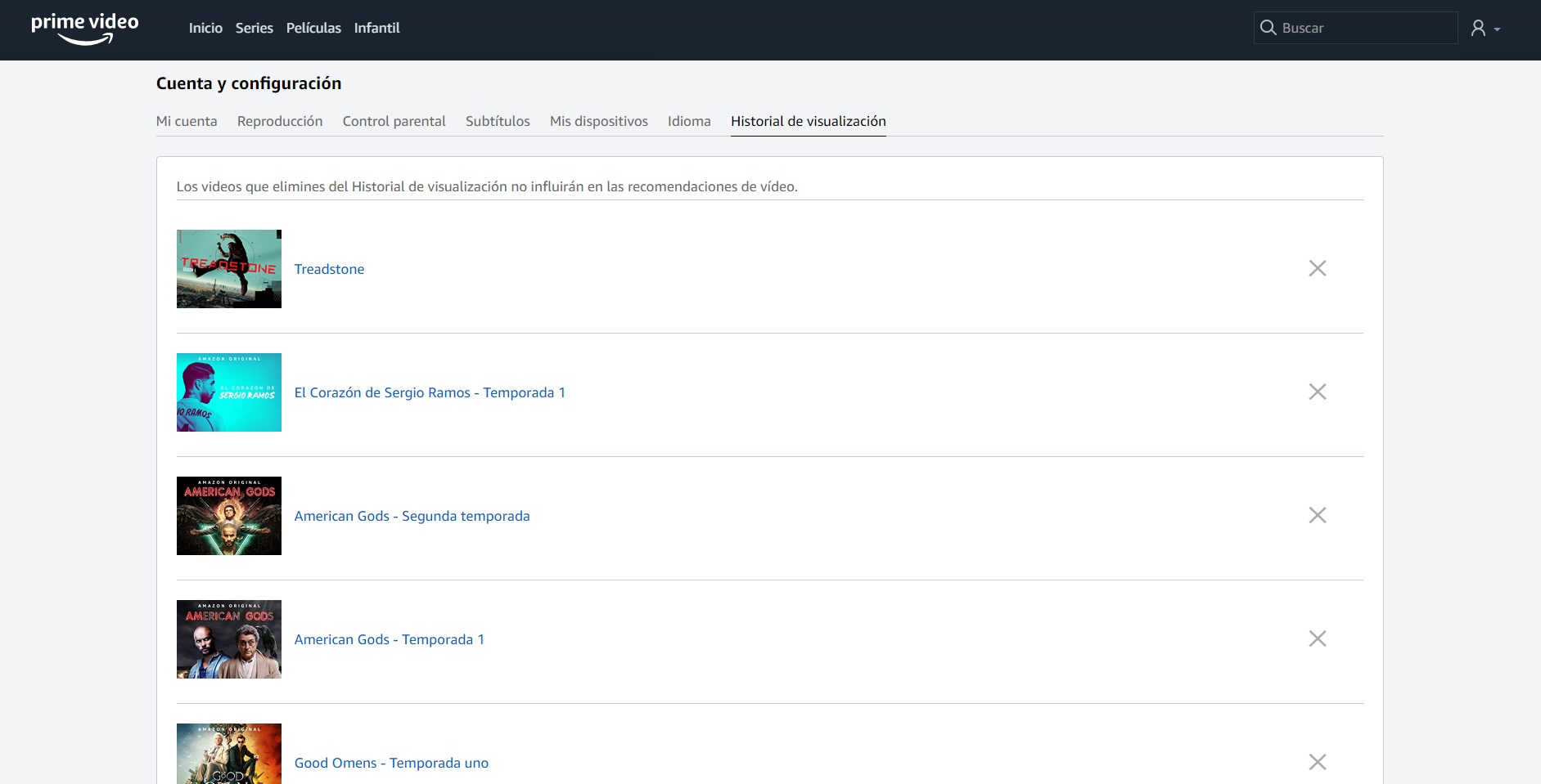 De nuevo con la “Cuenta y configuración” abierta, ve hasta “Historial de visualización” y cliquea sin miedo. Amazon mostrará todos y cada uno de los vídeos que has consultado. La pena es que no enseña episodios de manera independiente, sino que si has visto una serie en concreto, esta aparece como “Temporada 1”, “Temporada 2”, etc. En este sentido, es menos directo que Netflix, que sí permite eliminar episodio por episodio.