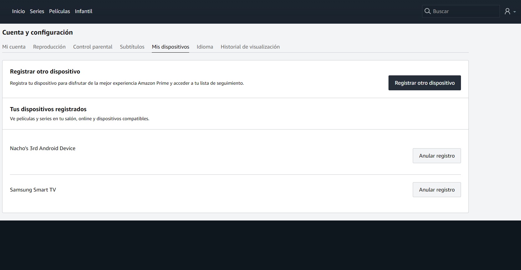 Para ello, vuelve a acceder a tu perfil y cliquea en “Cuenta y configuración”. Dentro, localiza “Mis dispositivos” y mira bien la lista de terminales (televisiones, smartphones, etc.) que poseen acceso a tu cuenta de Amazon Prime Video. Si hay alguno sospechoso, ya sabes qué tienes que hacer. Así mismo, en caso de que desees añadir otro más, sólo necesitas cliquear sobre “Registrar otro dispositivo” y el proceso quedará almacenado en tu cuenta.
