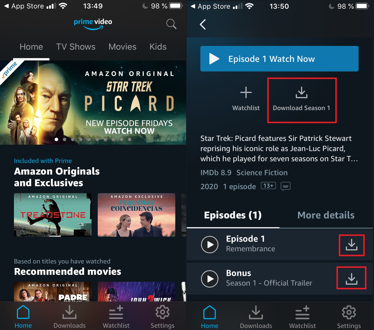 La particularidad de esta función es que sólo está disponible en aplicaciones móviles o los dispositivos oficiales de Amazon. Por tanto, descárgala en tu smartphone y fíjate bien que aparece una flecha señalando hacia abajo. Cliquea ahí para descargar ese capítulo, película, etc.