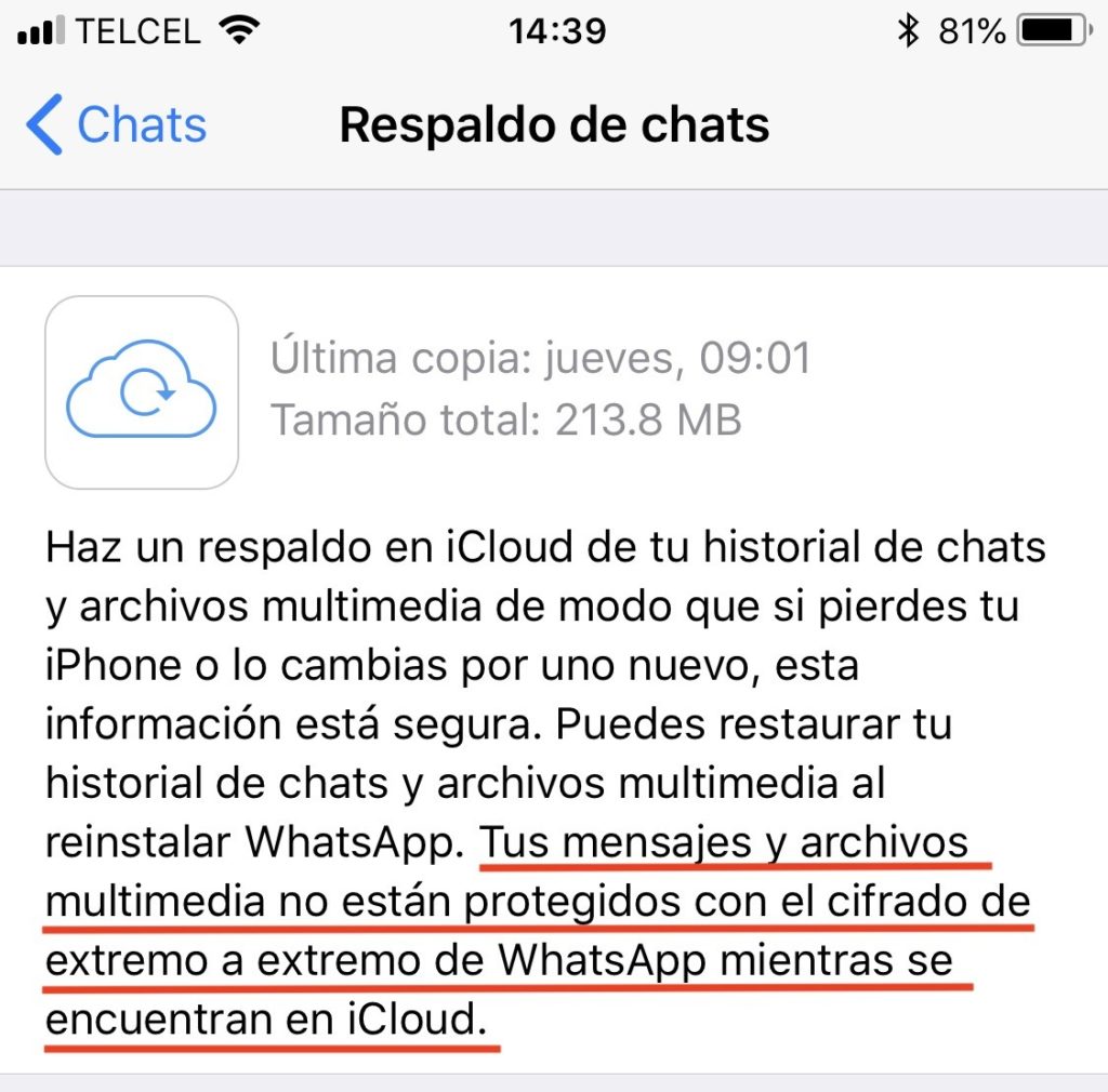 “Importante: Los archivos multimedia y mensajes que guardes no estarán protegidos por el cifrado de extremo a extremo de WhatsApp mientras están en Google Drive”.