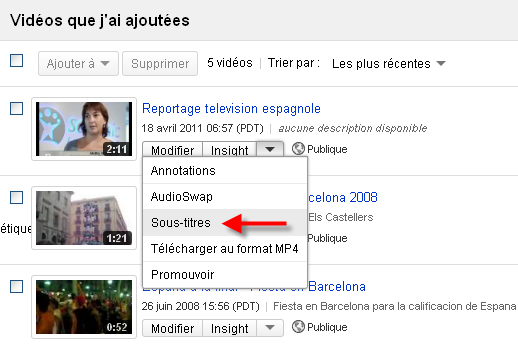 Chacune de vos vidéos dispose de trois boutons: Modifier, Insights et une petite flèche. C’est sur cette dernière qu’il faut cliquer pour faire apparaître la possibilité d’ajouter des sous-titres, comme le montre l’image suivante.