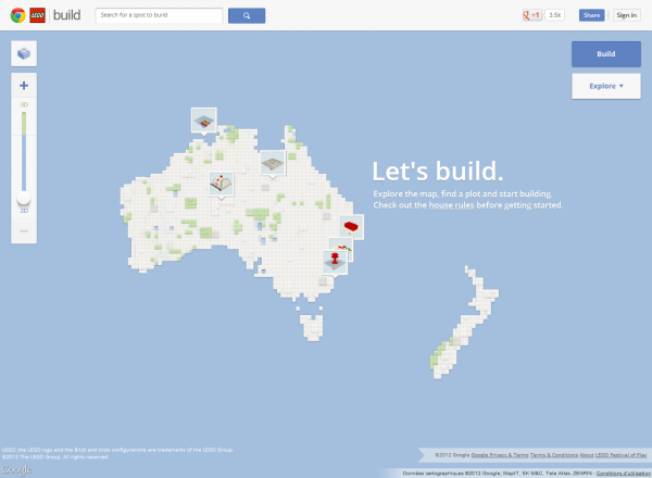 Build s’appuie sur Google Maps et propose aux internautes un terrain de jeu situé en Australie et en Nouvelle-Zélande. L’application vous laisse choisir un emplacement (un carré de 32×32) sur lequel vous pouvez laisser libre cours à votre imagination.