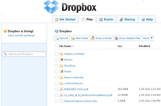On peut aussi accéder à ses fichiers sans installer de logiciel, en se connectant à DropBox depuis n’importe quel navigateur internet. Voici donc l’équivalent d’une clé USB de 2Go, gratuite, ou extensible à 50 ou 100 Go en passant à un compte payant (9,99$ / mois pour 50 Go). En prime, les données sont cryptées une fois en ligne, ce qui permet de conserver des données privées ou confidentielles et de pouvoir y accéder n’importe où, à condition d’avoir une connexion internet. Pour plus d’infos, vous pouvez consulter notre tutoriel sur DropBox.