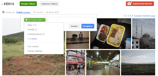 Une fois dans cette partie de Google+ où sont visibles les dernières images mises en ligne par vos contacts, cliquez sur “Vos albums” dans la colonne de gauche et ouvrez celui que vous désirez cacher. Une petite note au début de l’album permet de voir la confidentialité de l’album. Un clic dessus suffit à accéder aux possibilités qui s’offrent à vous.