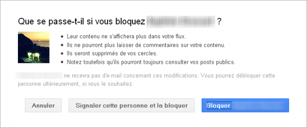 Nous avons parlé plus haut du spam, impossible avec un utilisateur qui ne fait pas partie de vos cercles. Malgré tout, si sa boulimie de partage a commencé après que vous l’ayez ajouté à un cercle, il est toujours possible de bloquer ce contact. Il suffit de se rendre sur sa page de profil et de cliquer sur le bouton “Bloquer” dans la colonne de gauche, sous la liste de ses contacts.