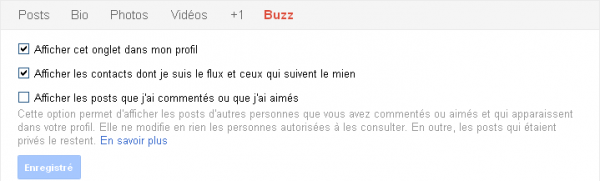 Les deux derniers onglets (+1 et Buzz) traitent du contenu web partagé par vos soins ou simplement mis en valeur par votre vote et vos commentaires. Vous pouvez leur permettre d’apparaître ou non aux yeux de vos contacts, d’un clic approprié. Vous pouvez aussi afficher ou cacher les flux que vous suivez particulièrement et ceux qui vous suivent.