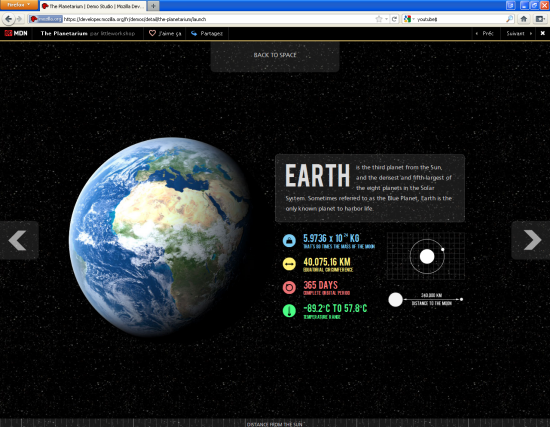 A titre d’exemple, la première de la liste, The Planetarium, présente succinctement notre système solaire grâce à des animations très fluides. Ne cherchez pas de Java Script sur cette page, tout est encodé en HTML5 et CSS3. Les plus développeurs d’entre vous apprécieront la qualité des transitions CSS3 pour animer les éléments HTML.