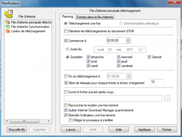 Le Planificateur d’Internet Download Manager est une fonctionnalité sacrément pratique. Vous pouvez créer une file d’attente de tous les fichiers à télécharger et programmer leur démarrage à l’heure que vous souhaitez. Pour ne pas ralentir la connexion internet des autres utilisateurs, il est parfois pratique de pouvoir lancer ses téléchargements à l’heure où tout le monde dort.