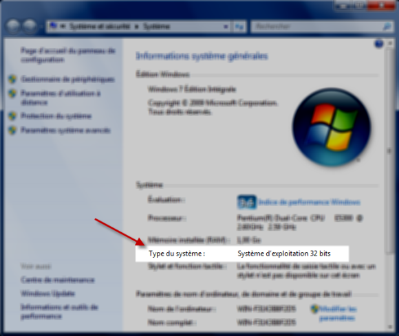 Avec Windows 7, c’est plus qu’un détail: beaucoup de logiciels ne sont compatibles qu’avec l’une de ces versions de Windows. Accédez aux propriétés du système en cliquant sur le menu Démarrer, puis clic droit sur Ordinateur, puis Propriétés. Ou alors, avec le raccourci-clavier suivant : Touche Windows + Pause. Cette fenêtre apparaît :