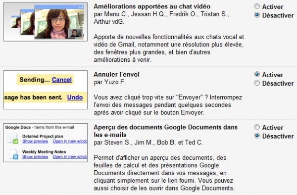 Voilà une partie terriblement intéressante pour les utilisateurs avancés de Gmail. Elle permet en effet d’accéder à des fonctionnalités qui ne sont pas encore mises en place sur Gmail, mais qui pourraient l’être prochainement si elles se montrent satisfaisantes aux yeux du public.