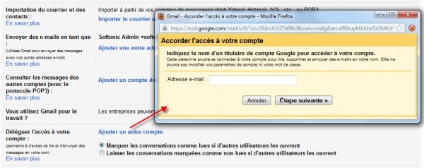 Déléguer l’accès à son compte, c’est possible, en cas d’absence ou d’indisponibilité. Il suffit d’indiquer son adresse en cliquant sur “Ajouter un autre compte“. Cela lui permettra ensuite de lire, supprimer et répondre en votre nom. En revanche, aucune modification des paramètres n’est autorisée de sa part.