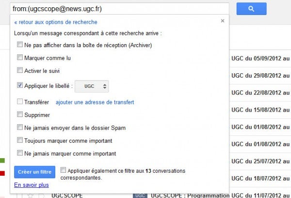 Pour créer un filtre, il suffit de cliquer sur le bouton nommé “Créer un filtre“. Une fenêtre s’ouvre sous le champs du moteur de recherche interne à Gmail. Il ne reste plus ensuite qu’à définir les paramètres de filtrage (nom de l’expéditeur, objet, contenant des mots spécifiques, etc.) ainsi que l’action qui en découle dans la fenêtre suivante (tri dans un libellé, effacer, suivi, etc.). Simple comme bonjour.