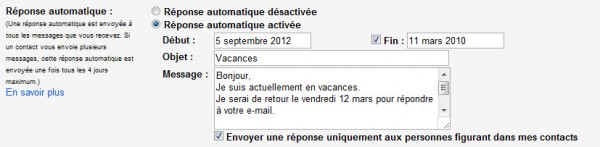 - Définir un gestionnaire d’absence. Si vous n’êtes pas apte à répondre à vos emails durant les prochains jours, Gmail permet d’écrire une réponse automatique spécifique pour expliquer aux contacts qui vous envoient des messages durant votre absence que vous ne pourrez répondre tout de suite. Il suffit d’indiquer la date de départ et de retour et écrire le message