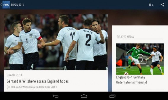Toujours pour Android, j’ai trouvé la très élégante application LiveSoccer World Football Cup qui, comme Coupe du Monde 2014 Brésil, offre actualités, photos et vidéos de la FIFA, mais avec un design amélioré, qui vous permet de recevoir des notifications sur l’équipe de votre pays.