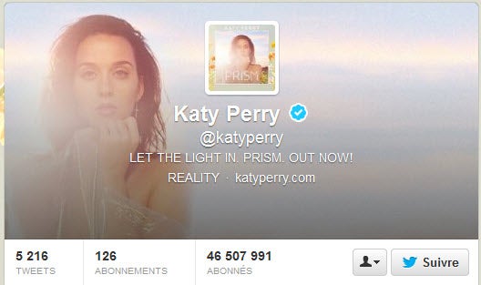 L’américaine Katy Perry est devenue ce week-end la personnalité la plus suivie sur le réseau social dépassant l’ancienne idole des jeunes, Justin Bieber. La chanteuse pop compte désormais plus de 46 500 000 abonnés à son compte, contre 46 492 000 pour Bieber.