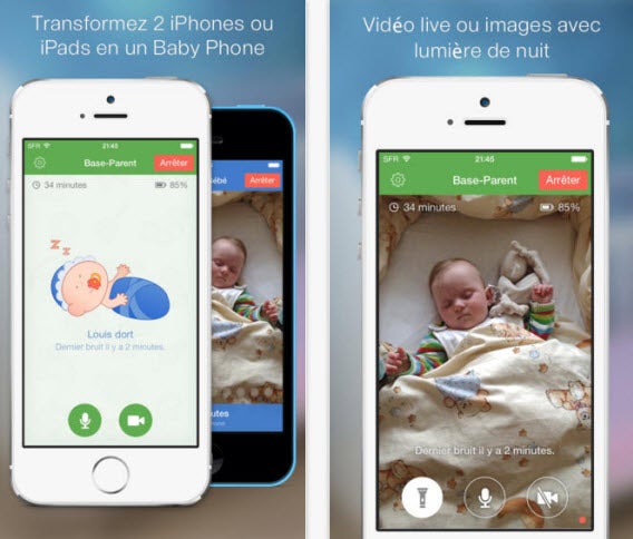 Ce n’est plus la peine d’investir dans un coûteux babyphone si vous possédez deux appareils fonctionnant avec le Wi-Fi et/ou la 3G. Grâce à l’application Babyphone 3G, vous pouvez surveiller votre nouveau-né à distance via le son et l’image de votre tablette ou de votre smartphone. L’utilisation est très simple : il suffit d’installer l’appli sur deux appareils sous iOS (iPhone, iPad ou iPod Touch) ou Android et de les utiliser comme de vrais Baby-Phone. Un appareil restera dans la chambre de bébé et l’autre restera avec vous. Vous entendrez immédiatement ce qui se passe dans la chambre de votre enfant. Petit plus, vous pourrez même parler à votre bébé.