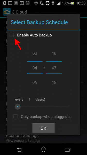 4. Par défaut, G Cloud Backup va planifier des sauvegardes quotidiennes de vos données. Si vous souhaitez désactiver ces dernières, rendez-vous dans les options de l’application en cliquant sur le bouton situé en haut à droite. Cliquez sur Back up Schedule, puis décochez la case en regard de Enable Auto Backup.