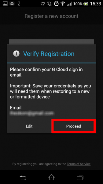 2. Cliquez sur New User pour créer un nouveau compte sur G Cloud Backup. Saisissez une adresse e-mail valide, choisissez un mot de passe puis cliquez sur Sign up. À l’étape suivante, confirmez que vous avez correctement orthographié votre adresse e-mail puis cliquez sur Proceed.