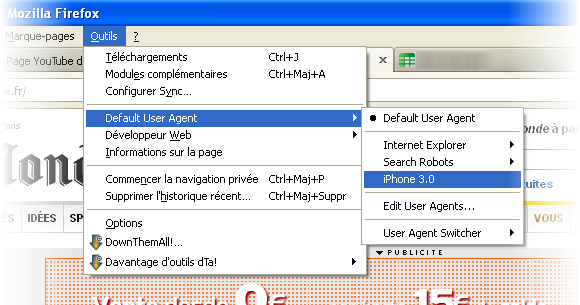 Vous l’aurez sûrement remarquer: si vous possédez un smartphone, de nombreux sites Web proposent désormais des versions mobiles de leur contenu. Beaucoup plus légères, ces pages offrent un temps de chargement très rapide, pratique pour les connexions 3G. Si votre connexion Internet est lente, vous pouvez “feinter” et faire croire au site Web que vous vous connectez depuis un téléphone portable. Pour ce faire, téléchargez l’extension User-Agent Switcher pour Mozilla Firefox.