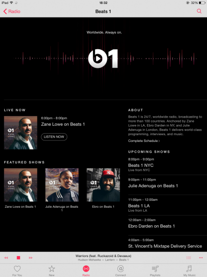 Pour ce qui est de la Radio, les émissions y sont classées par genres, à l’image de Beats 1 animée par des DJ comme Zane Lowe. Beats 1 ressemble à s’y méprendre à une vraie station de radio, puisque les programmes sont réellement émis en direct.