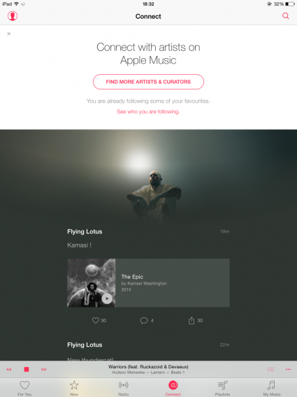 Connect, c’est l’endroit où les artistes vont partager du contenu avec vous: images, chansons, clips, et sûrement beaucoup plus de choses à l’avenir. Les artistes qui figurent dans ce feed sont représentatifs de tous les genres qui vous plaisent. Il s’agit là, à n’en pas douter, de la plus grande nouveauté d’Apple Music. Les réseaux sociaux, notamment Facebook, Twitter et Instagram, ont servi de tribune à beaucoup de musiciens et Apple Music entend bien tirer profit de cette expérience. Le succès de la fonctionnalité dépendra en fait de l’usage qu’en fera chaque artiste. Bien sûr, vous pouvez commenter, liker et partager les posts sur vos réseaux sociaux habituels.