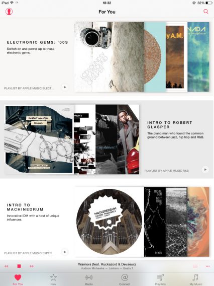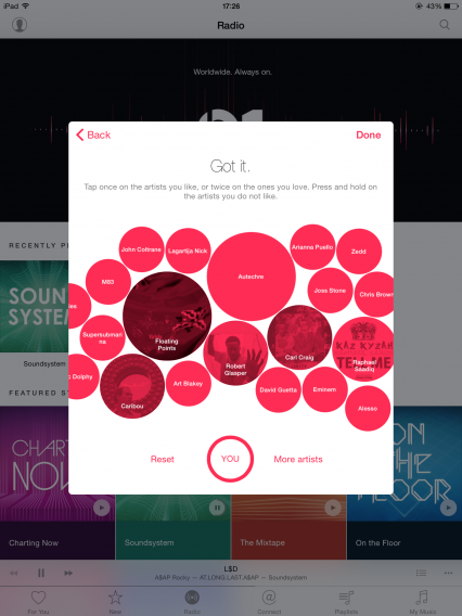 For You vous recommande des morceaux ou des émissions basés sur les genres musicaux et les artistes qui vous plaisent. Comme avec Beats Music, Apple Music vous demande au départ les styles que vous aimez le plus de manière à affiner ses recommandations. Ensuite, l’appli apprendra à mieux connaître vos goûts au fur et à mesure de votre utilisation et retiendra ce que vous gardez ou écoutez sur Beats Radio. Après avoir informé l’appli des artistes que j’aime, j’ai été désagréablement surpris de voir s’afficher des listes de type “Présentation de…”, des artistes en question. Si je les aime déjà, pourquoi donc aurais-je besoin d’une présentation de ces artistes?
