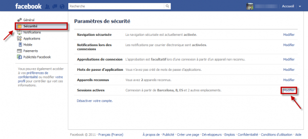 2 – Cliquer sur “Sécurité” et puis “Modifier” en face de “Sessions actives”